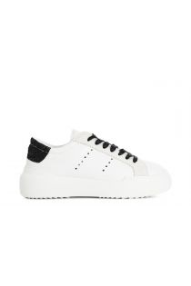 Damen-sneaker aus kunstleder. farbiger kragen und farbige schnürsenkel.