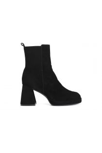 Damen-stiefelette aus wildleder mit abgerundeter form. interner reißverschluss an der innenseite des schuhs. die innensohle ist aus leder. dicker absatz 80 mm hoch.