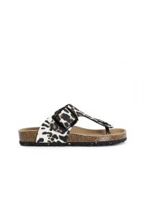 Damen-zehenstegsandalen aus bedrucktem stoff mit schnalle. bequemes fußbett.