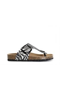 Damen-zehenstegsandalen aus bedrucktem stoff mit schnalle. bequemes fußbett.