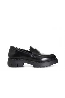 Damen-mokassin aus leder mit schlaufe und münzzubehör. futter und innensohle sind aus leder. 25 mm hohes plateau. 40 mm absatz.