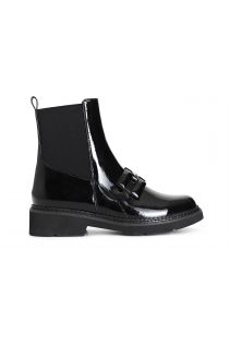 Damenstiefelette aus kunstleder mit lackeffekt. gummibänder an der seite des obermaterials erleichtern die passform. angereichert durch eine klemme an der schlaufe. die innensohle ist aus leder.
