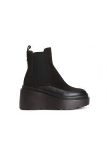 Damen-stiefelette aus wildleder mit seitlichen gummizügen. 70 mm absatz und 30 mm plateau. die innensohle ist aus leder.