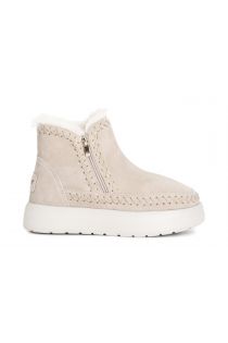 Damenstiefelette mit erhöhter sohle nähten und doppeltem reißverschluss. obermaterial aus wildleder und futter aus kunstfell.