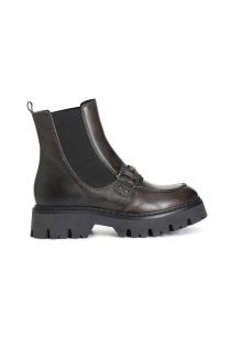 Stiefeletten mit gummizug aus gebürstetem leder und klemme an der schlaufe. die innensohle ist aus leder. die tanksohle aus extraleichtem material strafft das modell und macht es hyperaktuell.