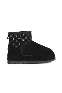 Damen-stiefelette aus wildleder mit logo-dekoration. das futter und die innensohle bestehen aus kunstfell. warmer und sehr bequemer schuh. ideal für kalte wintertage.