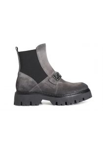 Wildlederstiefelette mit seitlichem gummizug und schmuckaccessoire. die innensohle ist aus leder. die tanksohle aus extraleichtem material strafft das modell und macht es hyperaktuell.