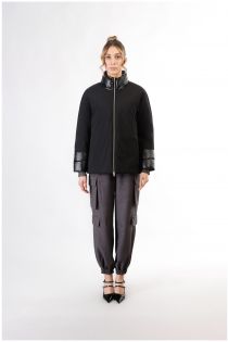 Kurze daunenjacke aus zwei materialien mit kapuze. kragen und ärmelabschluss aus ultraleichtem stoff. zum tragen bei schlechtem wetter auf dem weg zur arbeit oder bei einem spaziergang an der frischen luft mit familie oder freunden.