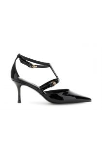 Schwarzer Lacklederpumps mit Doppelschnalle, zwei zarten Linien, die sich sanft an den Fuß schmiegen. 7,5 cm hoher Stilettoabsatz. Schmal zulaufende Silhouette, leuchtende Sohle.