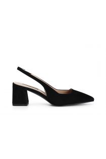 Dekolleté aus wildleder mit spitze. die innensohle ist aus leder. schmal geschnittener schuh. der klobige absatz beträgt 6.2 cm.