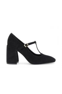 Wildlederpumps mit T-Riemen und goldener Schnalle auf einer Lederinnensohle für höchsten Tragekomfort. Ein 8,5 cm hoher Blockabsatz sorgt für sicheren Halt und elegante Raffinesse.
