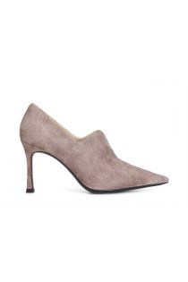 Dekolleté aus wildleder mit „v“-schnitt. feiner absatz 87 mm hoch. schlanke form. futter und innensohle sind aus leder. schuh mit elegantem und femininem stil.