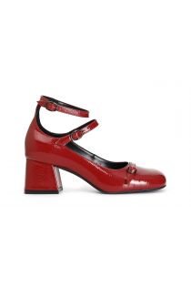 Pumps in lackoptik mit zwei knöchelriemen und 3 schnallen. 60 mm dicker absatz. die innensohle ist aus leder.
