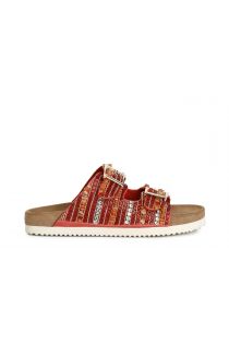 Flache slipper-sandalen mit doppelschnalle mit strass- und paillettenmotiv. lederfutter. 2.4 cm hoher keil. eine mischung aus boho- und ethno-stil für einen sommer voller stil