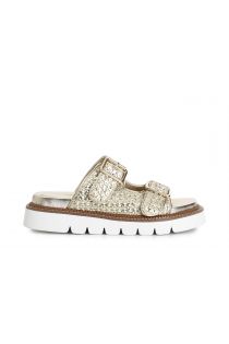 Gewebter slipper mit doppelschnalle. der keil ist 2.9 cm hoch. ein schuh der stil funktionalität und vielseitigkeit vereint. perfektes schuhwerk für den sommer das zu langen weiten röcken getragen werden kann.
