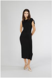 Ärmelloses kleid aus superstretch-stoff mit kordelzug an der schulter und drapierung an der seite. unterhalb des knies lang mit seitlichem schlitz auf einer seite. perfektes kleid mit hochhackigen schuhen für einen romantischen und eleganten abend.