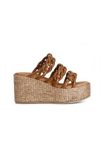 Slipper mit drei ineinander verschlungenen bändern. keilschuh mit bast.