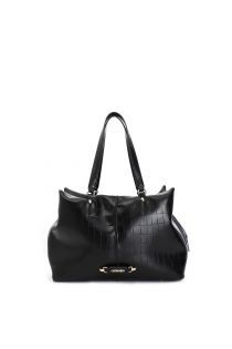 Einkaufstasche aus synthetischem material mit kroko-print. anbringen von anhängern mit metallbeschriftung. reißverschluss. innentasche mit reißverschluss.