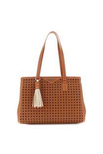 einkaufstasche aus lederimitat mit elegantem geometrischem perforationsmuster auf der vorderseite tan