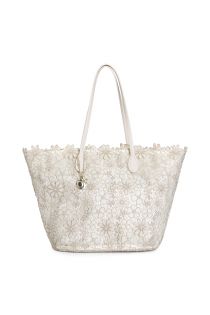 Einkaufstasche aus spitze mit stofffutter griffen in lederoptik und metallanhänger mit kette. raffinierte eleganz und ideale kapazität für lässige und schicke looks