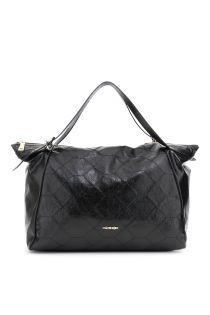 Einkaufstasche aus weichem, metallisch schimmerndem Kunstleder mit geometrischer Stickerei auf der Vorderseite, verstellbaren Schulterriemen mit quadratischer Schnalle und Metallschriftzug. Markantes und geräumiges Design.