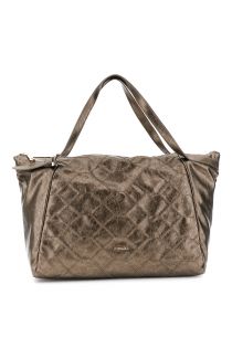 Einkaufstasche aus weichem, metallisch schimmerndem Kunstleder mit geometrischer Stickerei auf der Vorderseite, verstellbaren Schulterriemen mit quadratischer Schnalle und Metallschriftzug. Markantes und geräumiges Design.