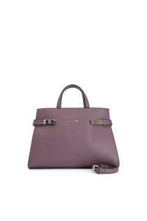 Tote-bag aus material mit gerb-effekt und metallverschlüssen. die tasche kann in der hand oder mit einem optionalen schultergurt getragen werden.