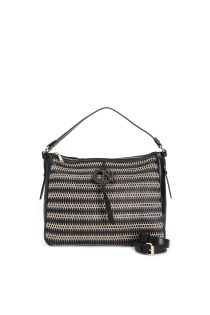 Umhängetasche aus gewebtem netzstoff mit handgefädeltem cn-logo und bindeknotendetail. ausgestattet mit abnehmbarem schultergurt und reißverschluss perfekt für jeden anlass.