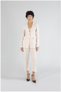 Ungefütterte einreihige jacke aus nadelstreifen-leinenstoff. ein-knopf-verschluss und leistentaschen mit patte. vervollständigen sie den look mit dem passenden oberteil und der passenden hose. der leichte stoff begleitet ihre looks durch die frühling-sommer-saison.
