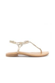 flache leder-flip-flop-sandalen mit geflochtener stickerei gold