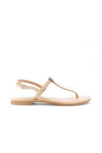 Flache flip-flop-sandalen mit dünnen riemen und verstellbarem knöchelriemen. der mittelriemen ist mit zierperlen und einer schmuckschnalle verziert. bequeme lederinnensohle und flexible 1.4 cm sohle. ideal für elegante und dennoch unkomplizierte sommer-looks.