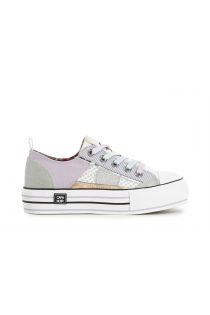 Flache sneaker mit patchwork-effekt aus stoff und laminierten einsätzen mit spiegeleffekt.
