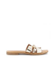 flacher lederpantoffel mit breitem riemen und schmuckaccessoire gold
