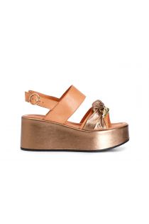 Zweifarbige laminierte franziskanersandalen aus leder auf keilsohle mit ketten-accessoire.