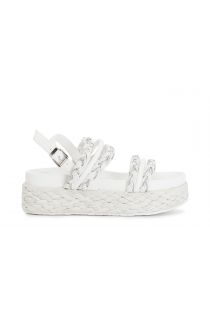 Colour block sandalen aus geflochtenem raffiabast mit strasseinsatz. bequemes fußbett und der keil ist mit raffiabast umwickelt.