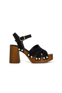 Clogs mit hohem holzabsatz und plateau. rauledergeflecht und knöchelriemchen