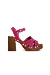 Clogs mit hohem holzabsatz und plateau. rauledergeflecht und knöchelriemchen