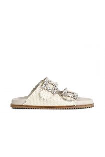 Damen-slipper aus gewebtem leder mit doppelter strassschnalle. innensohle leder.