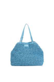gehäkelte tragetasche mit buntem herzanhänger und bastborte aquamarine