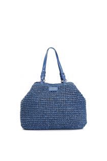 gehäkelte tragetasche mit buntem herzanhänger und bastborte blue