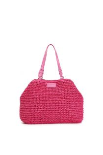 gehäkelte tragetasche mit buntem herzanhänger und bastborte hot pink