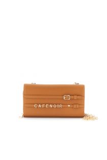Geldbörse in Lederoptik mit zwei Fächern, eines mit Klappe und eines mit Reißverschluss, verziert mit Schriftzügen und einer Schnalle. Abnehmbarer Schulterriemen aus Kette.