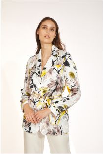 Weiche, geschwungene einreihige Jacke aus gemustertem Viskose-Satin mit Schärpe in der Taille