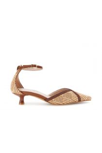 Geschlossene pumps mit knöchelriemen obermaterial in bastoptik und geflochtenen details. lederinnensohle 4.5 cm absatz. elegant leicht und perfekt für schicke sommer-looks.