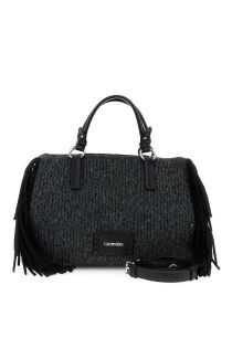 Strickhandtasche in Wolloptik mit seitlichen Fransen, zwei Tragegriffen und verstellbarem Schulterriemen. Details aus Kunstleder, ein Logo-Etikett vorne und Zierknöpfe an den Seiten.