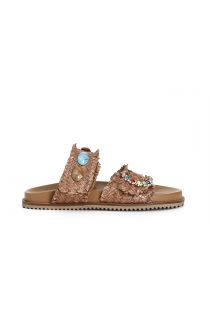 Geflochtener lederpantoffel mit doppelschnalle. juwelenaccessoire. klettverschluss. futter und innensohle sind aus leder. bequemes 2.5 cm hohes fußbett.