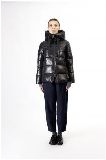 Daunenjacke mit fester kapuze aus superleichtem stoff mit glänzendem finish. bedrucktes nylonfutter mit unserem „be noir“-slogan. im inneren befindet sich ein praktischer riemen aus jacquardband mit logo mit dem sie das kleidungsstück an den heißesten tagen wie einen rucksack tragen können.