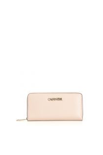 Großes portemonnaie mit umlaufendem reißverschluss aus glattem material mit metallschriftzug.