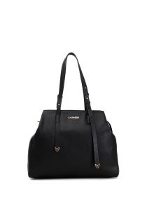 Große, geräumige Shoppingbag mit der Möglichkeit, den oberen Teil der Tasche mit einem Karabinerhaken zu öffnen und zu schließen, sodass sich die Taschenform verändert. Griffe mit Verzierung in Schnallen-Optik