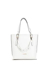 Halbstarrre shopper mit griffen die durch metallschnallen gesichert und mit einer kette aus weichem material versehen sind.